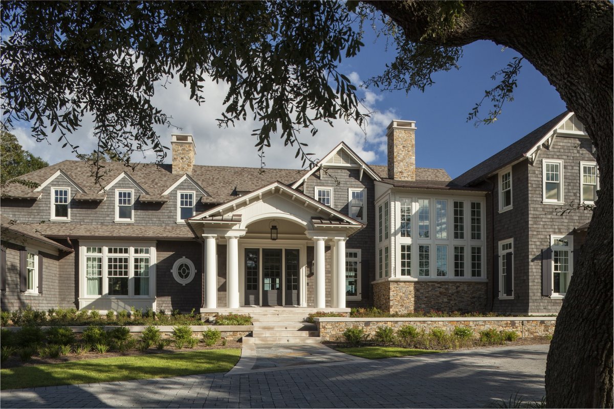 For this lovely Coastal Shingle–style home, E. F. San Juan supplied Loewen impact-rated windows and doors, E. F. San Juan Invincia® impact-rated custom mahogany entry doors, exterior board-and-batten siding, exterior shingles, and exterior trim and millwork. We also supplied all the interior doors, Oak Pointe stair parts, paneling, mouldings, and millwork. The home has since generated record sales for real estate in its area and has been featured in multiple publications.