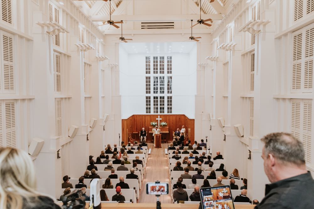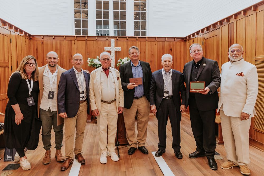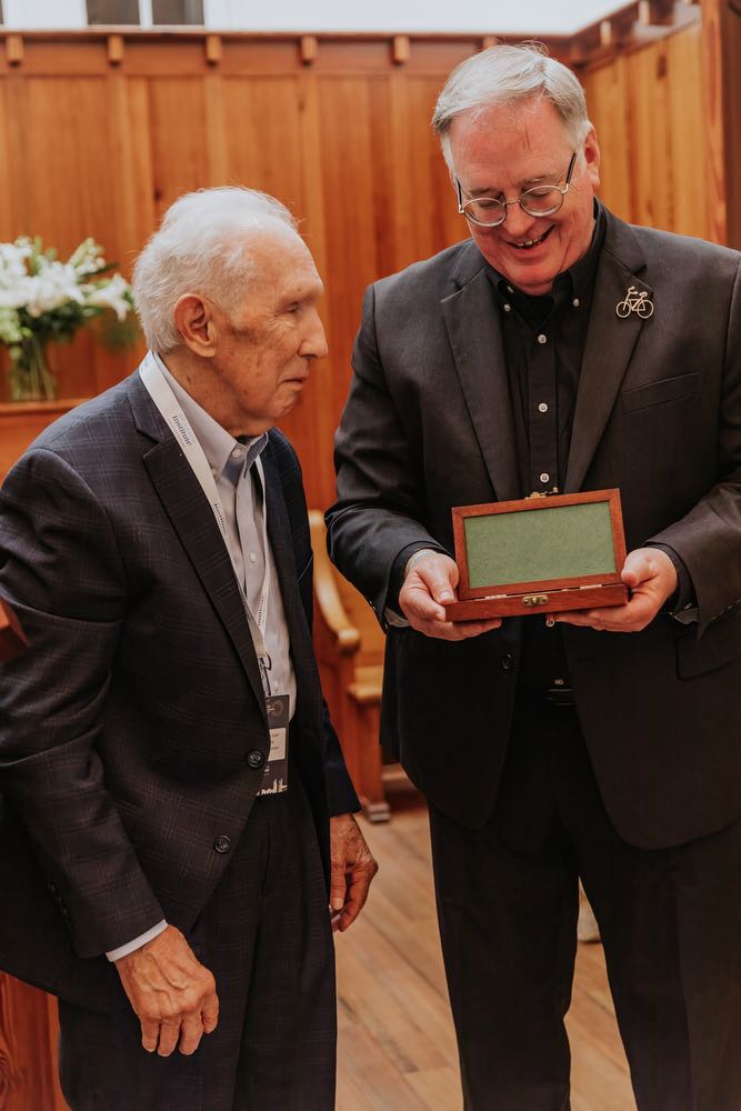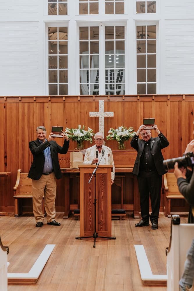 The small box perfectly contours to hold the bronze key-shaped award in place. The first to receive the prize in these new enclosures were Victor Dover and Joseph Kohl, with our president, Edward A. San Juan, and Seaside cofounder Robert S. Davis presenting this meaningful award to them at the Seaside Chapel in February 2024. This is a beautiful presentation piece made with a felt interior and mahogany exterior. Being a part of this award is a memorable experience for the San Juan family, as their work has graced homes and buildings in Seaside, including the Chapel, since the town’s inception in the early 1980s.